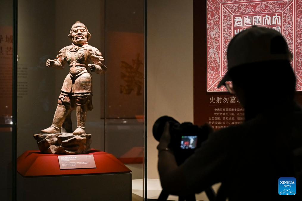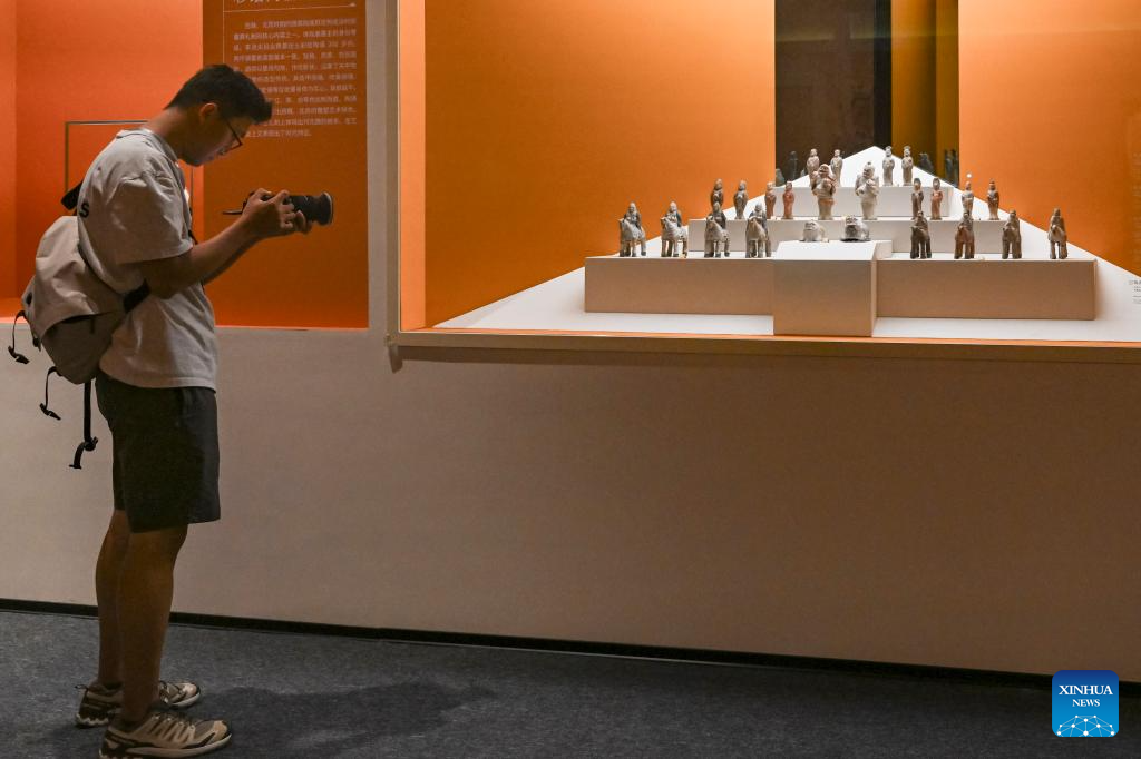 A media worker takes photos of pottery figurines on display during a cultural relic exhibition at the Shanghai Museum East in east China's Shanghai, July 8, 2025. The exhibition, featuring over 300 cultural relics from Guyuan City of northwest China's Ningxia Hui Autonomous Region, opened in Shanghai on Tuesday. (Xinhua/Chen Haoming)