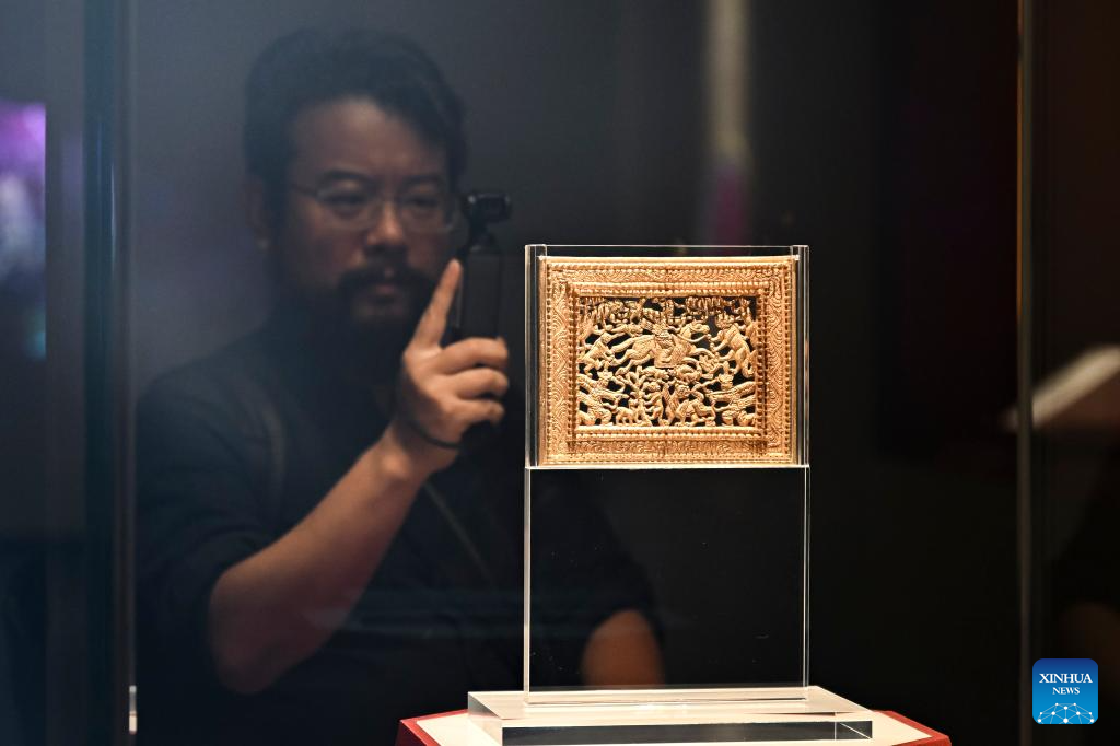 A media worker takes photos of an exhibit during a cultural relic exhibition at the Shanghai Museum East in east China's Shanghai, July 8, 2025. The exhibition, featuring over 300 cultural relics from Guyuan City of northwest China's Ningxia Hui Autonomous Region, opened in Shanghai on Tuesday. (Xinhua/Chen Haoming)