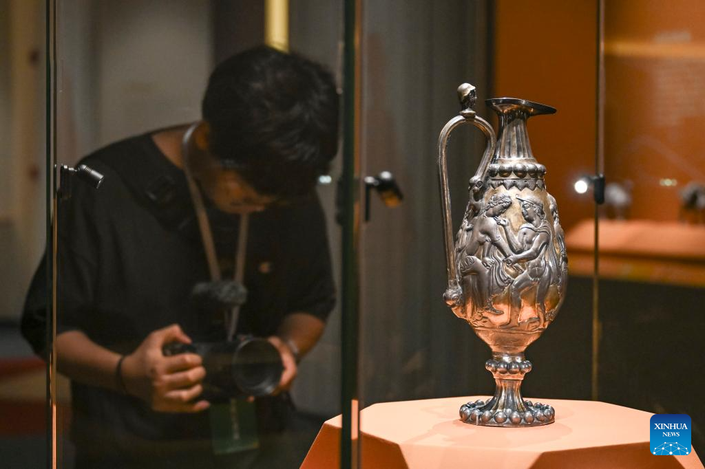 A media worker takes photos of a silver pot on display during a cultural relic exhibition at the Shanghai Museum East in east China's Shanghai, July 8, 2025. The exhibition, featuring over 300 cultural relics from Guyuan City of northwest China's Ningxia Hui Autonomous Region, opened in Shanghai on Tuesday. (Xinhua/Chen Haoming)
