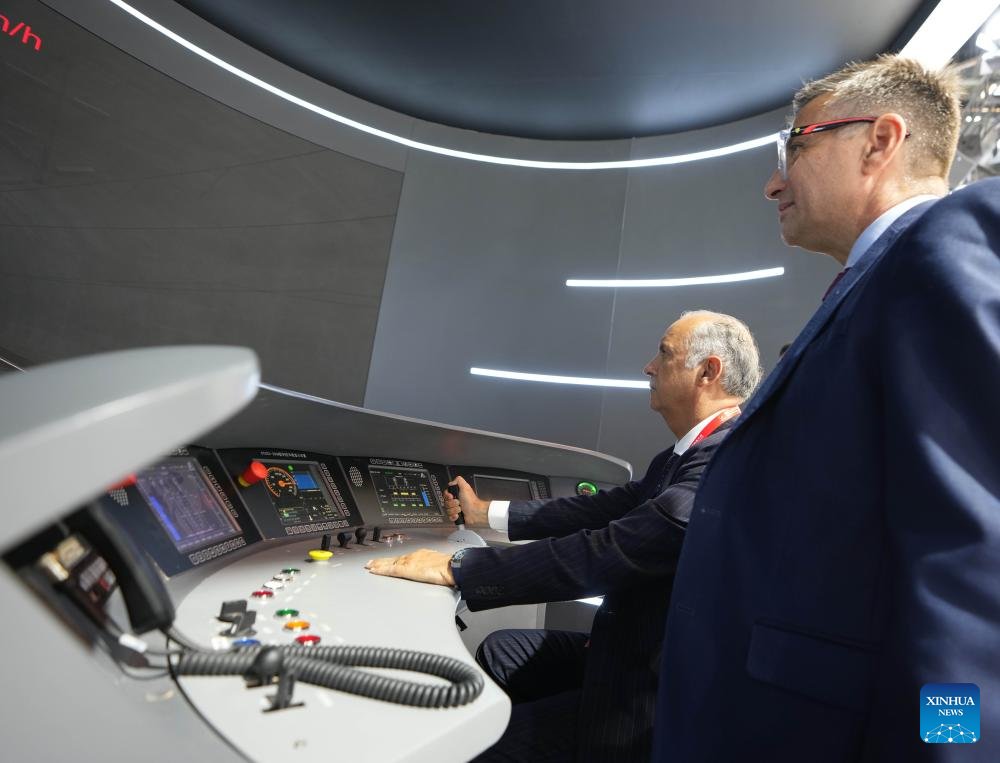A visitor tries simulated driving of high-speed railway train during the Modern Railways 2025 exhibition in Beijing, capital of China, July 8, 2025. The exhibition kicked off here on Tuesday, showcasing advanced railway technologies and equipments from all over the world. (Xinhua/Xing Guangli)