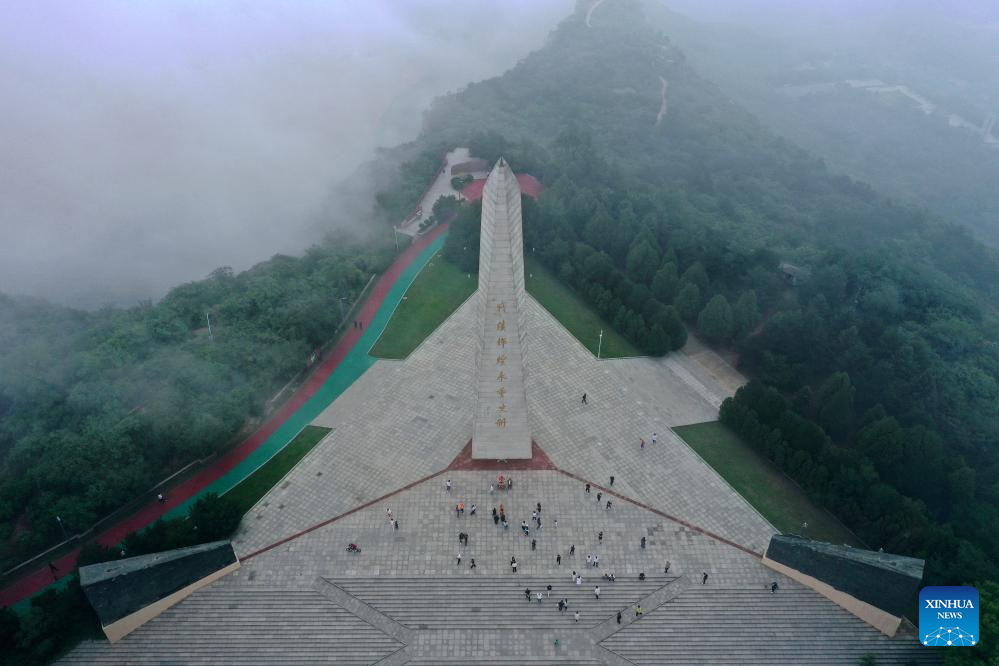 An aerial drone photo taken on July 8, 2025 shows tourists visiting a monument to the Hundred-Regiment Campaign in Yangquan, north China's Shanxi Province. The Hundred-Regiment Campaign took place in northern China from August 1940 to January 1941 during the Chinese People's War of Resistance Against Japanese Aggression. (Xinhua/Zhan Yan)