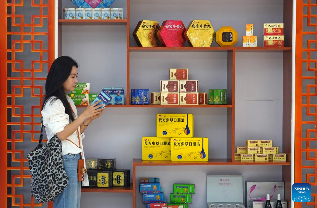 A visitor watches products at a show room of a pharmaceutical company in Zhangshu, east China's Jiangxi Province, July 8, 2025. Zhangshu City has been a well-known industrial hub of traditional Chinese medicine (TCM) for centuries. In recent years, the city has leveraged its rich heritage in TCM to actively support enterprises in further research and development based on classic TCM prescriptions.