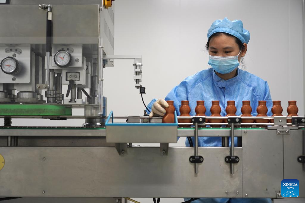 A staff member works at a workshop of a pharmaceutical company in Zhangshu, east China's Jiangxi Province, July 8, 2025. Zhangshu City has been a well-known industrial hub of traditional Chinese medicine (TCM) for centuries. In recent years, the city has leveraged its rich heritage in TCM to actively support enterprises in further research and development based on classic TCM prescriptions.