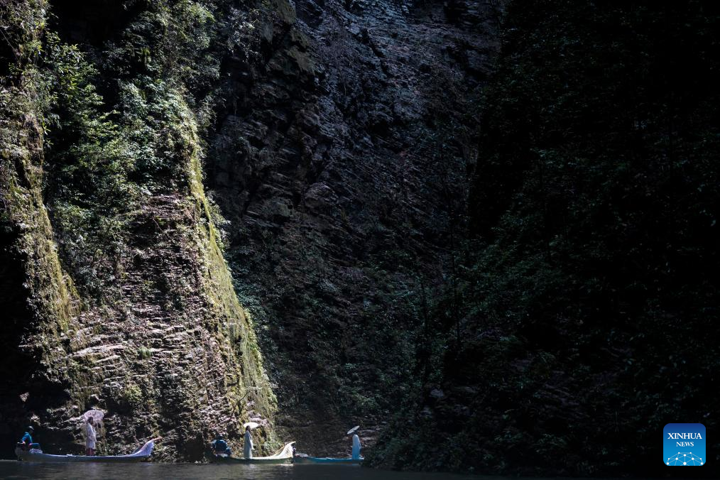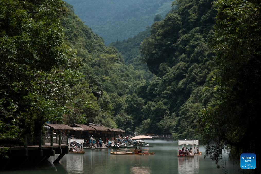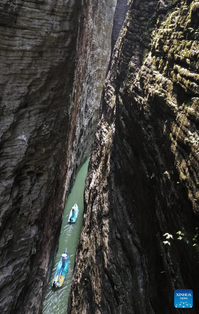 Tourists take boats enjoying the view of Pingshan canyon in Hefeng County, Enshi Tujia and Miao Autonomous Prefecture, central China's Hubei Province, July 9, 2025. The unique canyon landscape and limpid water make the Pingshan Canyon an attractive destination for tourists. (Xinhua/Wu Zhizun)