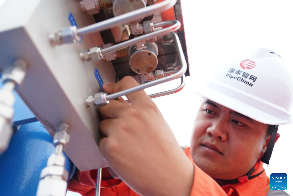 Engineers check facilities at a gas transmission pipeline station in Heihe, northeast China's Heilongjiang Province, July 9, 2025. As of July 10, the cumulative gas transmission volume of the China-Russia east-route natural gas pipeline's China section has surpassed 100 billion cubic meters. The pipeline's China section begins in Heihe, a city in the country's northeast bordering Russia, and transports natural gas from Siberia all the way south to Shanghai, China's economic and financial hub. (Xinhua/Wang Song)