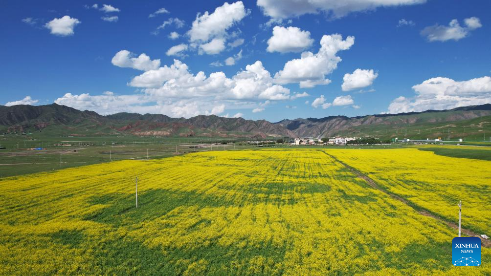 An aerial drone photo taken on July 10, 2025 shows a rape flower field at the Sangke Grassland in Xiahe County, Gannan Tibetan Autonomous Prefecture, northwest China's Gansu Province. (Xinhua/Yu Lan)