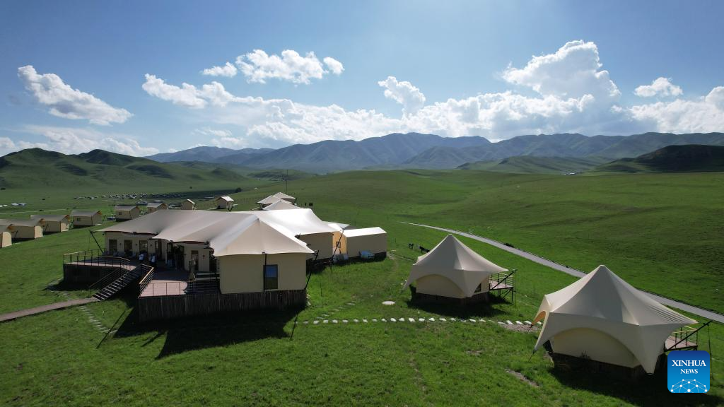 An aerial drone photo taken on July 10, 2025 shows a camp at the Sangke Grassland in Xiahe County, Gannan Tibetan Autonomous Prefecture, northwest China's Gansu Province. (Xinhua/Yu Lan)