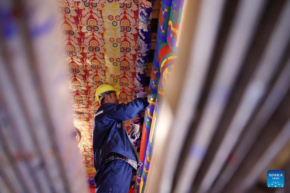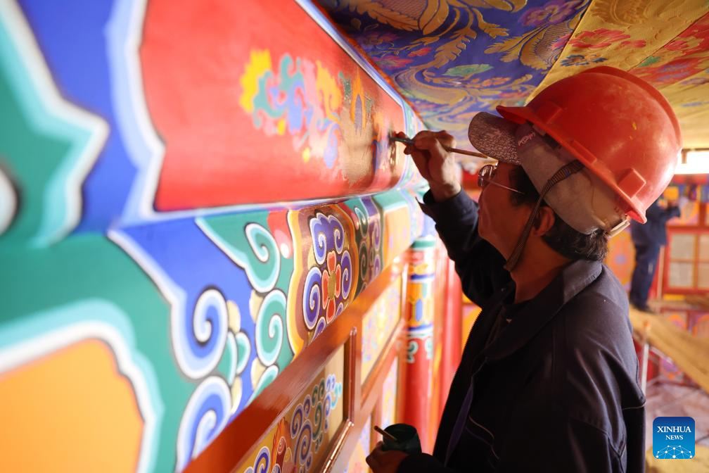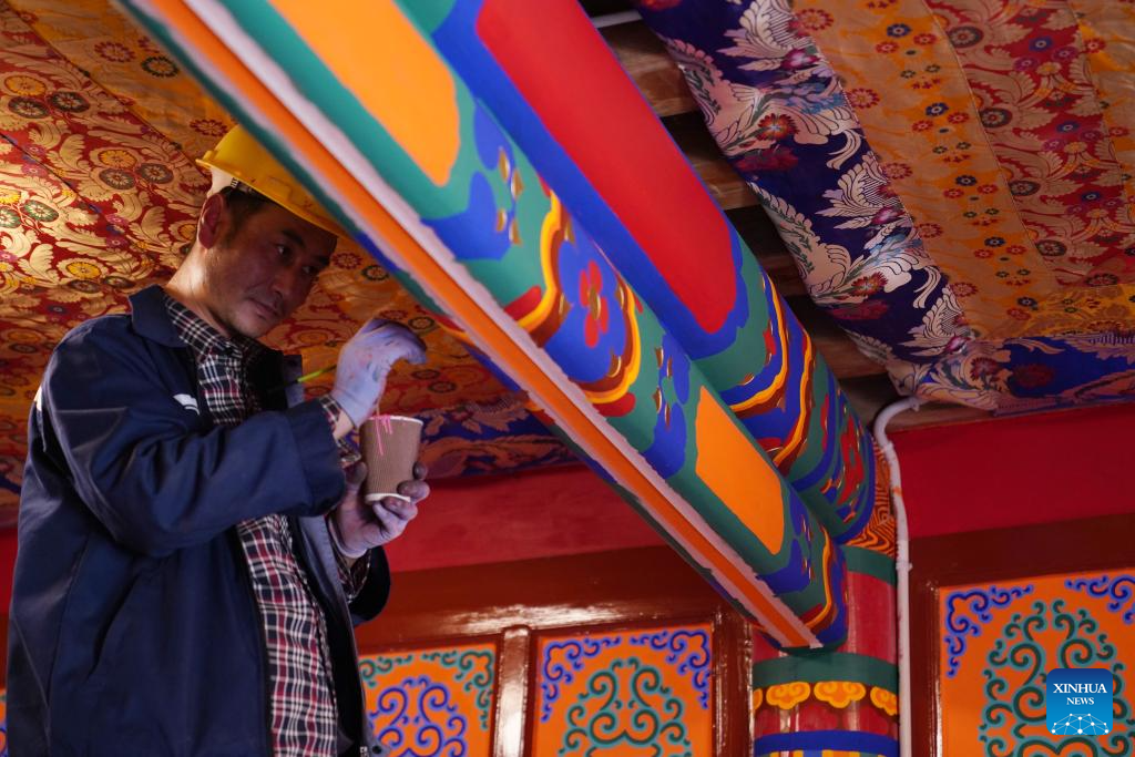 A staff member repairs the oil paintings of the wooden structure at Labrang Monastery in Xiahe County of Gannan Tibetan Autonomous Prefecture, northwest China's Gansu Province, July 10, 2025. After years of renovation, the oil painting protection and restoration of the wooden structure at Labrang Monastery, which serves as a top Tibetan Buddhism educational institution in China, has come near to completion. Some Buddha halls have been opened to the public.