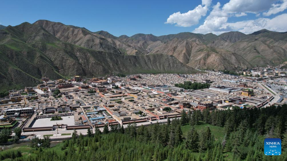 An aerial drone photo taken on July 10, 2025 shows Labrang Monastery in Xiahe County of Gannan Tibetan Autonomous Prefecture, northwest China's Gansu Province. After years of renovation, the oil painting protection and restoration of the wooden structure at Labrang Monastery, which serves as a top Tibetan Buddhism educational institution in China, has come near to completion. Some Buddha halls have been opened to the public.