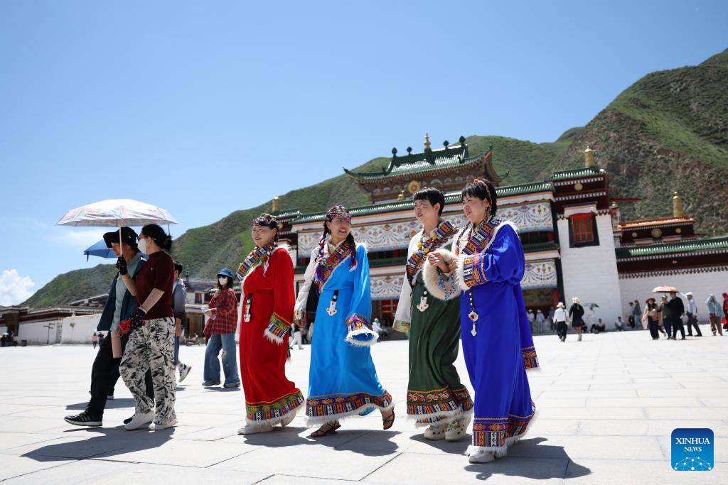 Tourists visit Labrang Monastery in Xiahe County of Gannan Tibetan Autonomous Prefecture, northwest China's Gansu Province, July 10, 2025. After years of renovation, the oil painting protection and restoration of the wooden structure at Labrang Monastery, which serves as a top Tibetan Buddhism educational institution in China, has come near to completion. Some Buddha halls have been opened to the public.