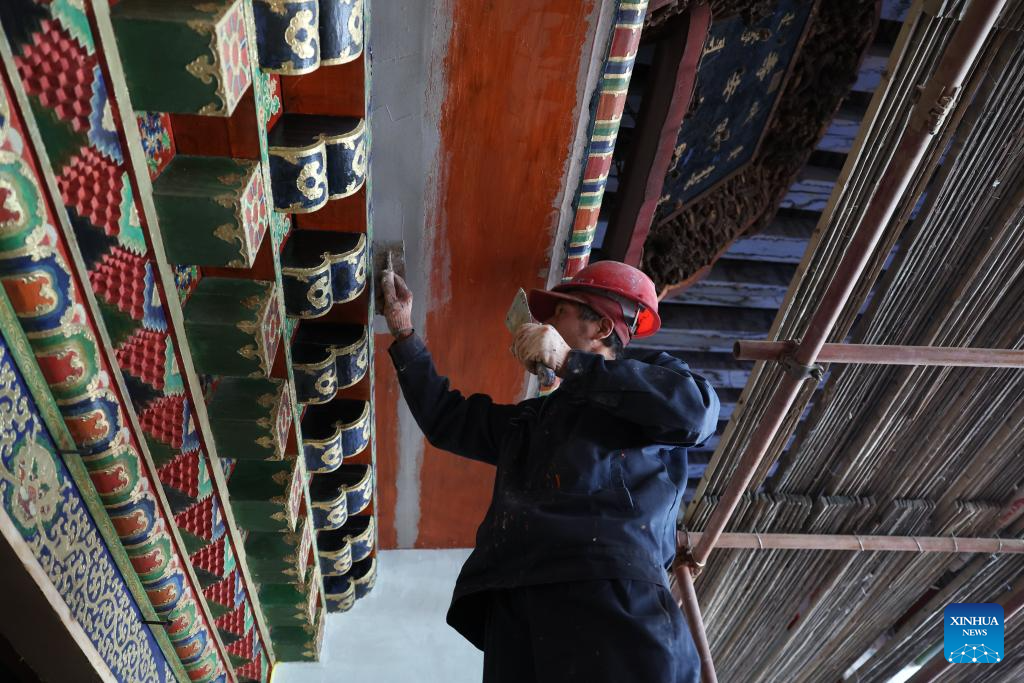 A staff member repairs the wooden structure of Labrang Monastery in Xiahe County of Gannan Tibetan Autonomous Prefecture, northwest China's Gansu Province, July 10, 2025. After years of renovation, the oil painting protection and restoration of the wooden structure at Labrang Monastery, which serves as a top Tibetan Buddhism educational institution in China, has come near to completion. Some Buddha halls have been opened to the public.