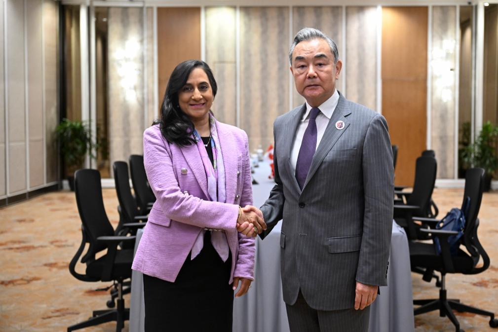 Chinese Foreign Minister Wang Yi, also a member of the Political Bureau of the Communist Party of China Central Committee, meets with Canadian Foreign Minister Anita Anand in Kuala Lumpur, Malaysia, July 11, 2025. (Xinhua/Cheng Yiheng)