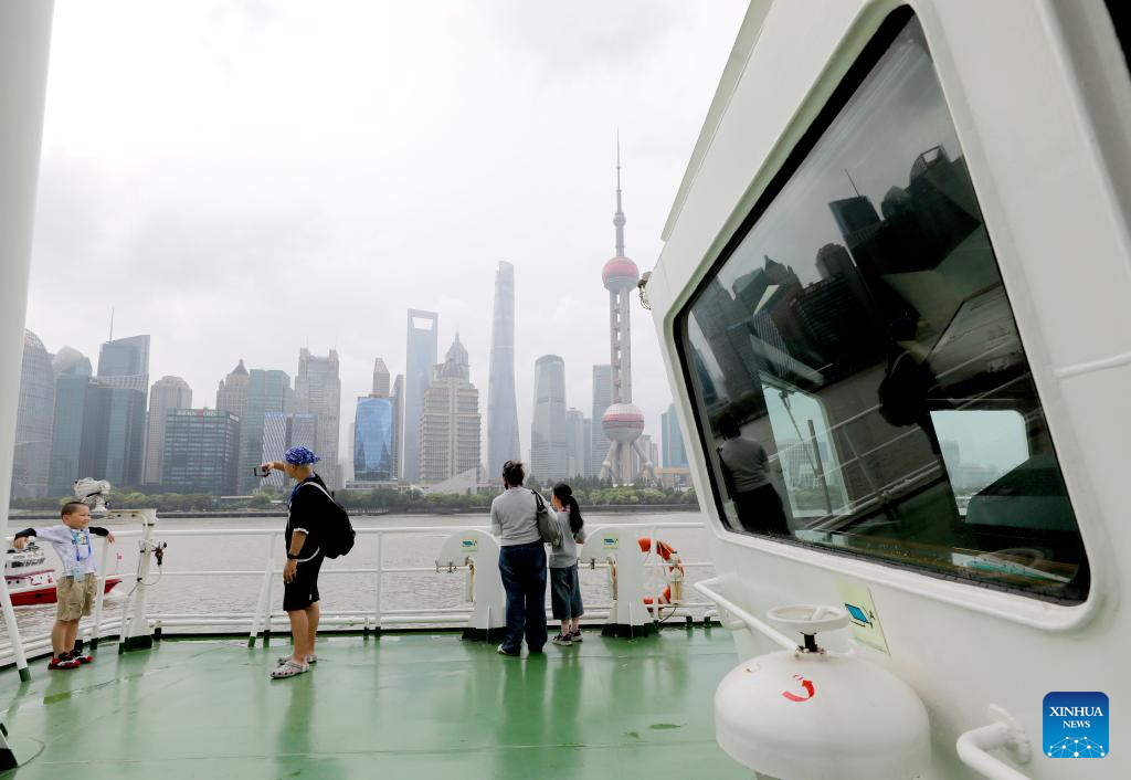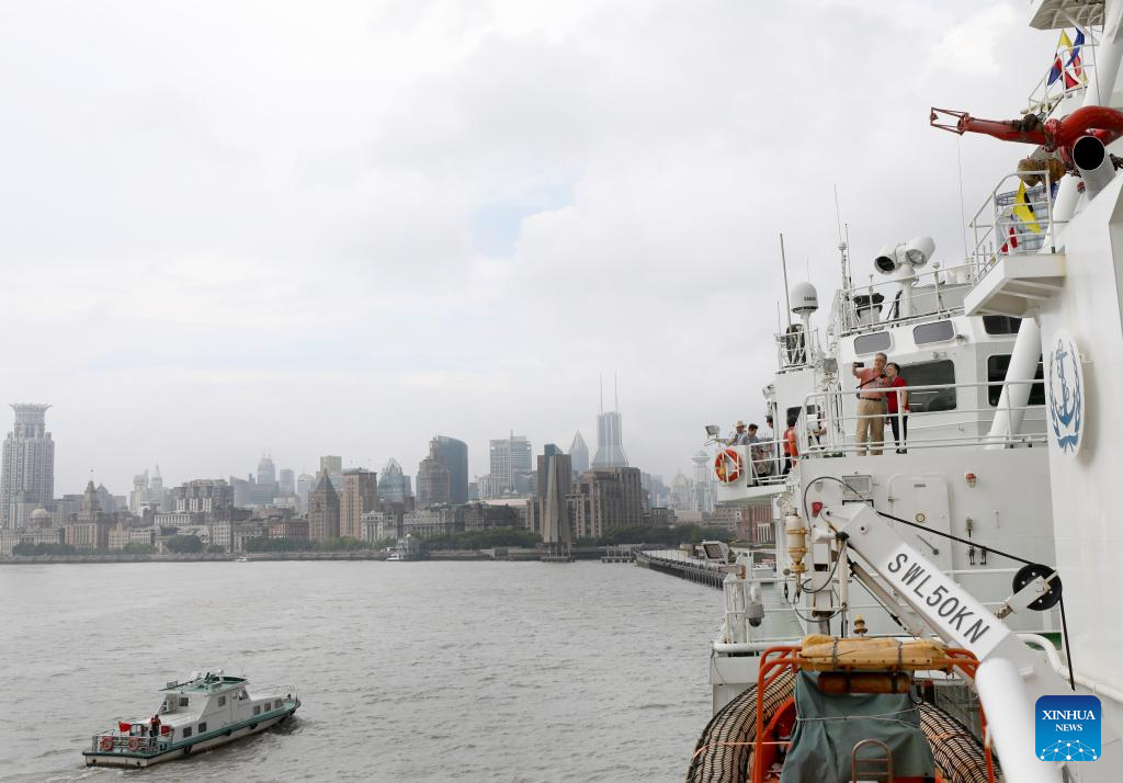 Tourists visit a ship during an open day event at a port in east China's Shanghai, July 11, 2025. July 11 marks the Maritime Day of China. (Xinhua/Fang Zhe)