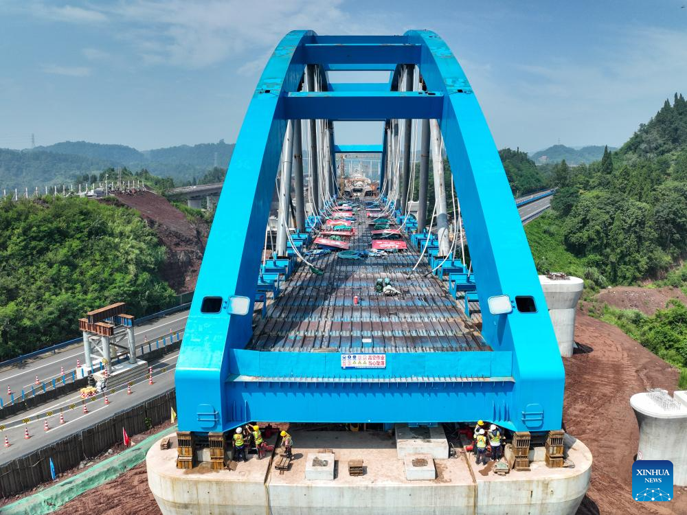 The main body of a bridge of Xi'an-Chongqing high-speed railway over an expressway linking Yingshan and Dazhou in Sichuan Province was smoothly lowered onto its piers on Friday. This marks the successful completion of the incremental launching construction for China's first large-span high-speed railway network arch bridge with tied girders, laying a solid foundation for the timely opening of the Xi'an-Chongqing high-speed railway.