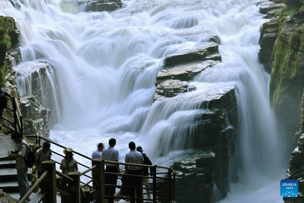 Tourists enjoy the view of Enshi Grand Canyon in Enshi Tujia and Miao Autonomous Prefecture, central China's Hubei Province, July 10, 2025. Relying on ethnic culture, landscape resources and ecological culture heritage, the tourism market in Enshi continues drawing visitors since the beginning of this summer. (Photo by Song Wen/Xinhua)