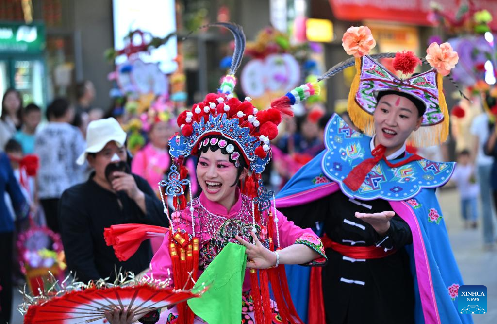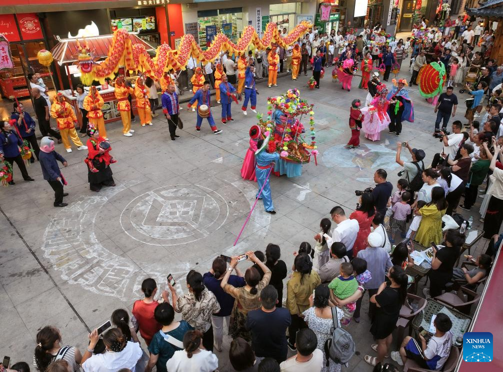 Folk artists perform Lichuan Dengge, a national intangible cultural heritage, in Lichuan City, Enshi Tujia and Miao Autonomous Prefecture, central China's Hubei Province, July 10, 2025. Relying on ethnic culture, landscape resources and ecological culture heritage, the tourism market in Enshi continues drawing visitors since the beginning of this summer. (Photo by Song Wen/Xinhua)