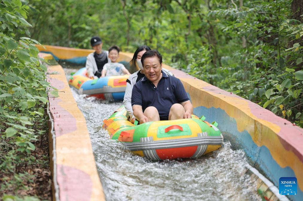 People enjoy rafting at a scenic spot in Luzhou, southwest China's Sichuan Province, July 13, 2025. With heatwaves hitting some Chinese provinces and regions in recent days, the scorching temperature has fueled a cooling economy boom. (Photo by Liao Shengchun/Xinhua)