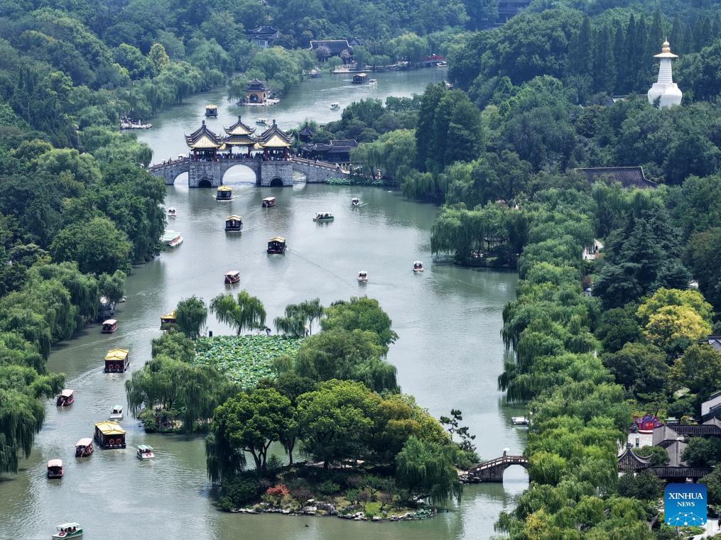 An aerial drone photo taken on July 13, 2025 shows tourists taking boat tours at the Slender West Lake scenic spot in Yangzhou, east China's Jiangsu Province. With heatwaves hitting some Chinese provinces and regions in recent days, the scorching temperature has fueled a cooling economy boom. (Photo by Meng Delong/Xinhua)