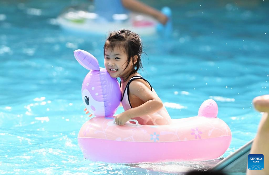 A girl has fun at a water park in Zaozhuang, east China's Shandong Province, July 12, 2025. With heatwaves hitting some Chinese provinces and regions in recent days, the scorching temperature has fueled a cooling economy boom. (Photo by Li Zhijun/Xinhua)