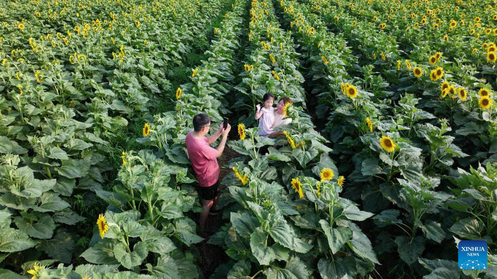 An aerial drone photo taken on July 12, 2025 shows visitors taking photos with sunflowers in Ruyang County of Luoyang, central China's Henan Province. With heatwaves hitting some Chinese provinces and regions in recent days, the scorching temperature has fueled a cooling economy boom. (Photo by Kang Hongjun/Xinhua)