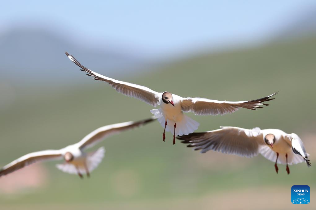 Brown-headed gulls fly over the Gahai wetland in Luqu County of the Tibetan Autonomous Prefecture of Gannan, northwest China's Gansu Province, July 11, 2025. Brown-headed gulls at the Gahai wetland attracted many tourists in summer. (Xinhua/Chen Bin)