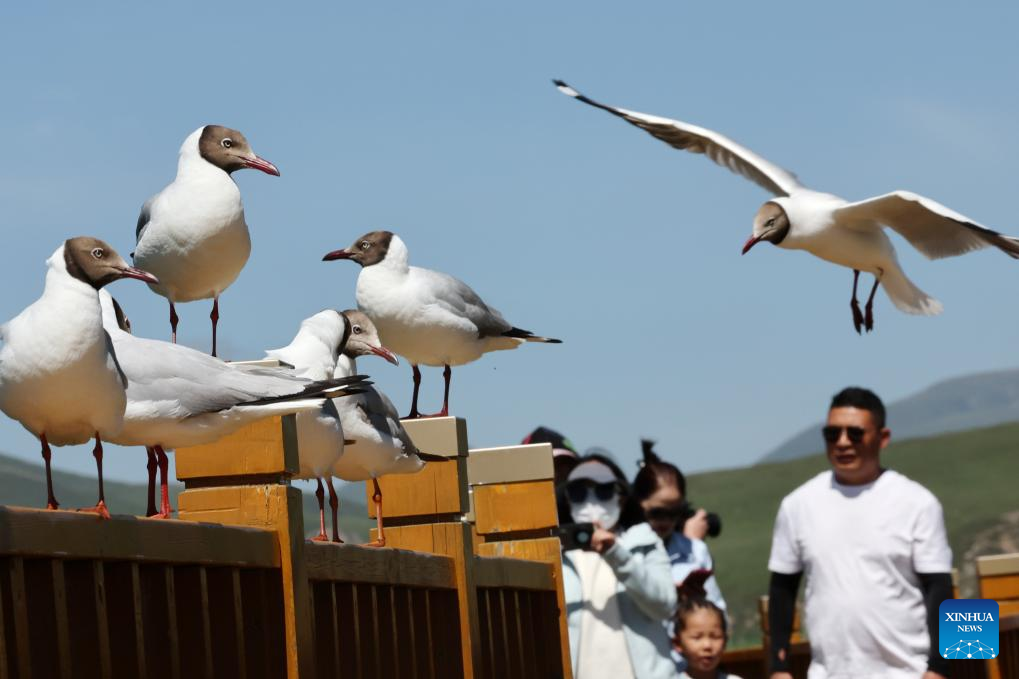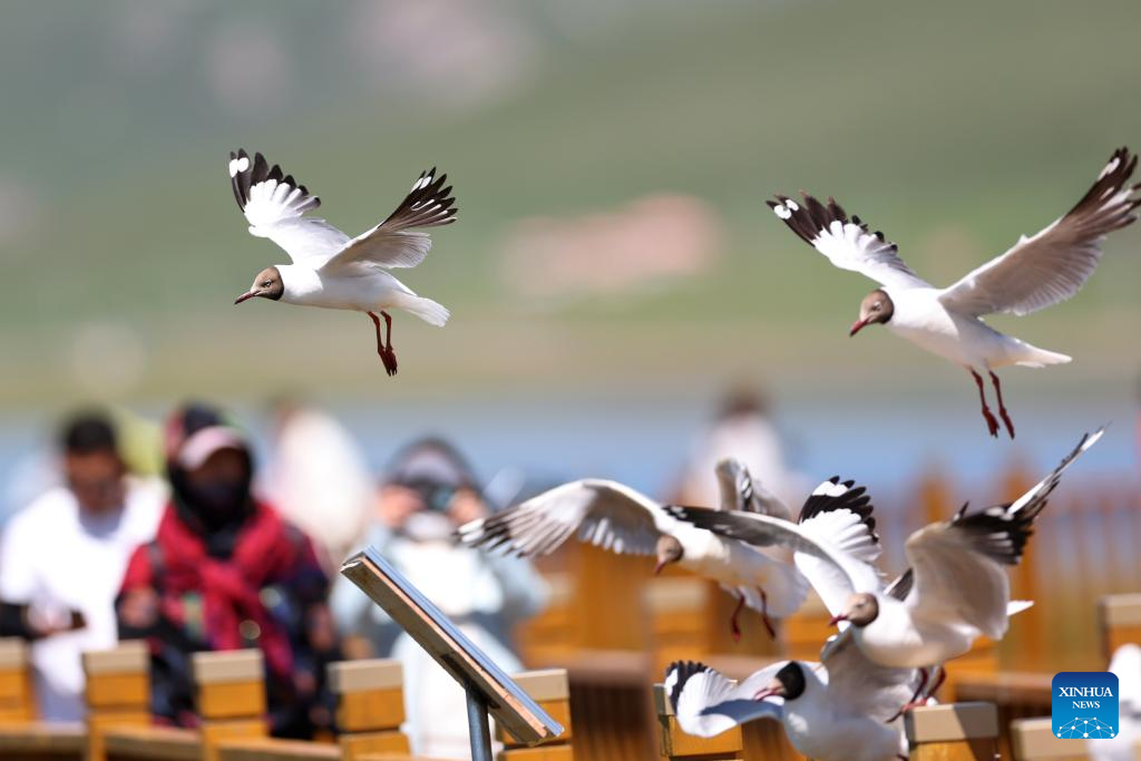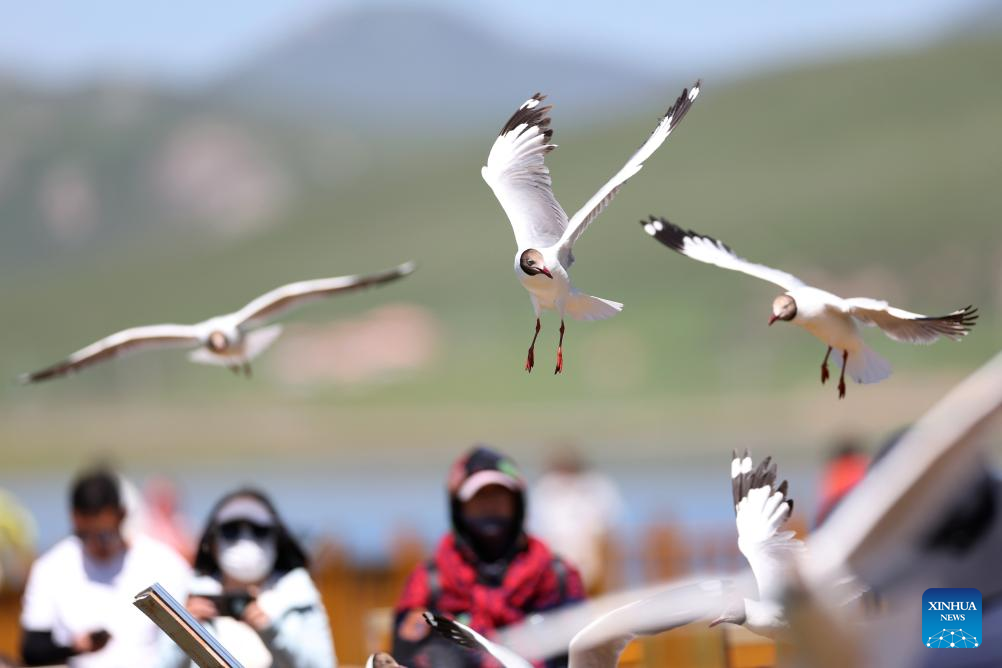 Tourists watch brown-headed gulls at the Gahai wetland in Luqu County of the Tibetan Autonomous Prefecture of Gannan, northwest China's Gansu Province, July 11, 2025. Brown-headed gulls at the Gahai wetland attracted many tourists in summer. (Xinhua/Chen Bin)