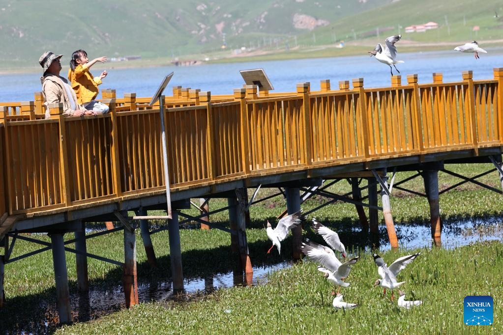 Tourists are seen on an observation deck at the Gahai wetland in Luqu County of the Tibetan Autonomous Prefecture of Gannan, northwest China's Gansu Province, July 11, 2025. Brown-headed gulls at the Gahai wetland attracted many tourists in summer. (Xinhua/Yu Lan)