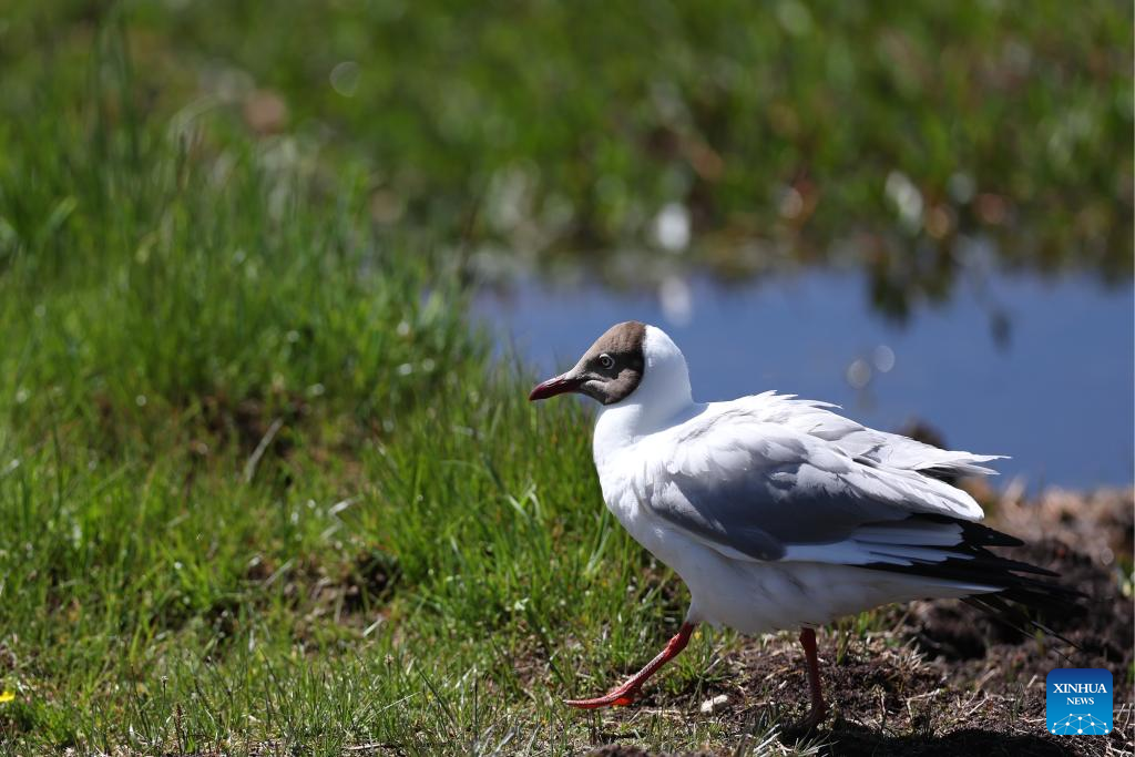 A brown-headed gull rests at the Gahai wetland in Luqu County of the Tibetan Autonomous Prefecture of Gannan, northwest China's Gansu Province, July 11, 2025. Brown-headed gulls at the Gahai wetland attracted many tourists in summer. (Xinhua/Ma Ning)