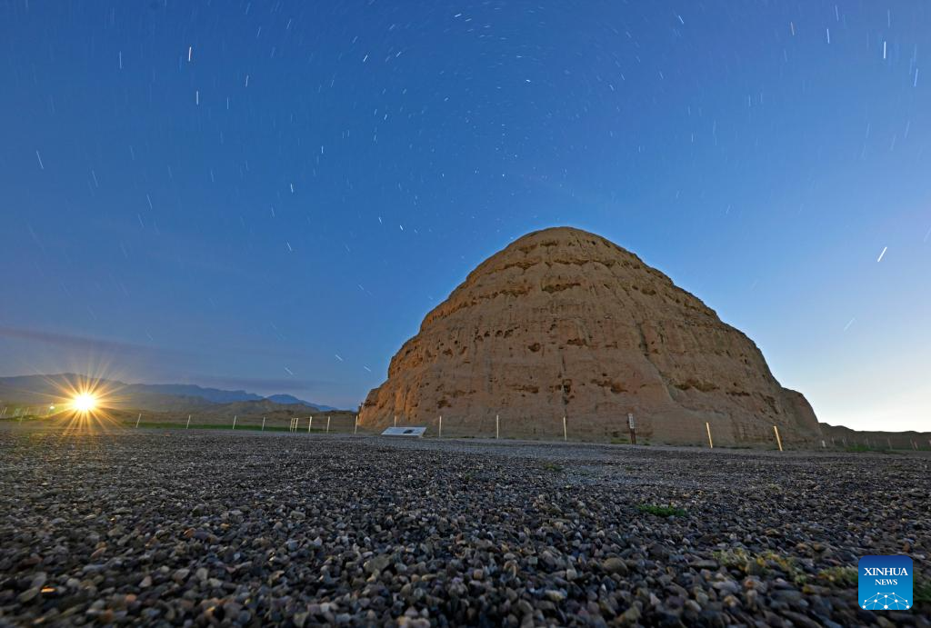 This photo taken on July 10, 2025 shows a Xixia imperial tomb under the stars in Yinchuan, northwest China's Ningxia Hui Autonomous Region. China's Xixia Imperial Tombs were officially added to the UNESCO World Heritage List on Friday during the 47th session of the World Heritage Committee held in Paris, France.The inscription brings the total number of World Heritage sites in China to 60. (Xinhua/Feng Kaihua)