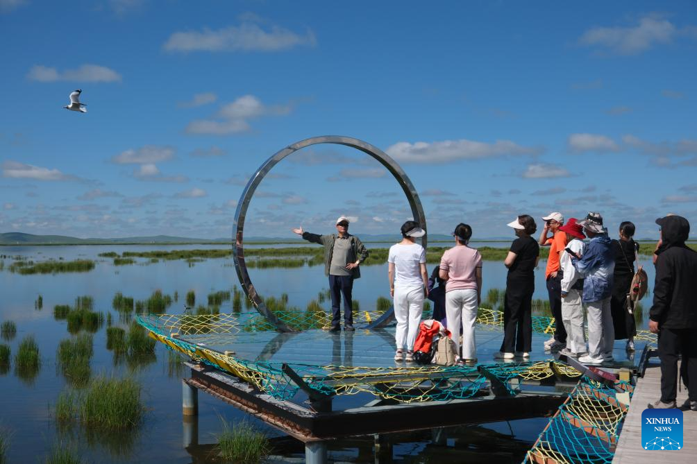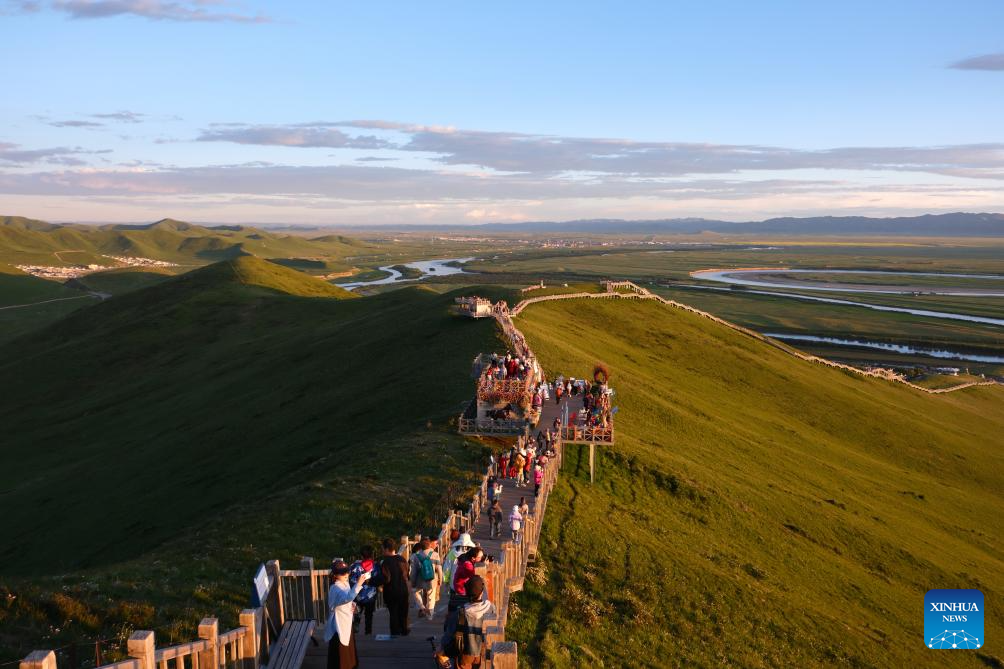Tourists stroll on a boardwalk of the Flower Lake scenic area in Ruoergai County, Aba Tibetan-Qiang Autonomous Prefecture, southwest China's Sichuan Province, on July 13, 2025. Ruoergai County has recently entered its peak summer tourism season, attracting tourists nationwide. (Xinhua/Tang Wenhao)