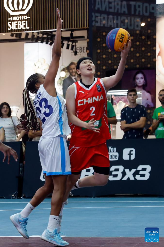 China's Zhou Mengyun (1st R) competes during the FIBA 3X3 Women's Series basketball match between China and Azerbaijan at Parklake mall in Bucharest, Romania, July 13, 2025. (Photo by Cristian Cristel/Xinhua)