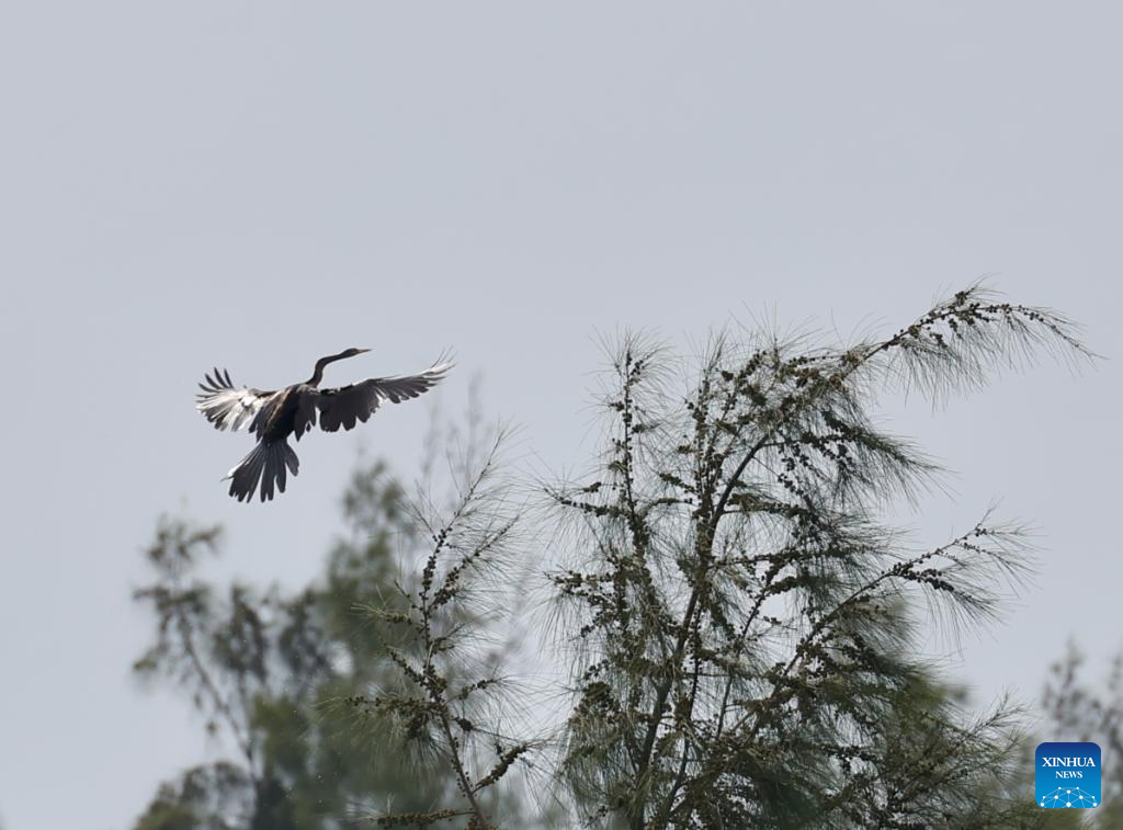 An Oriental Darter is pictured at Haiwei National Wetland Park in Changjiang Li Autonomous County, south China's Hainan Province, on July 12, 2025. An Oriental Darter (Anhinga melanogaster) has recently been observed for the first time in Hainan Province. The bird species is listed as near threatened on the IUCN Red List of Threatened Species and is extremely rare in China. (Photo by Xue Meili/Xinhua)