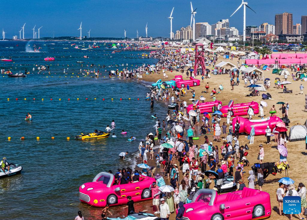 A drone photo taken on July 12, 2025 shows visitors enjoying themselves at a seaside scenic spot in Rongcheng City, east China's Shandong Province. High temperature during the summer vacation has triggered new vitality of cooling economy across the country. (Photo by Li Xinjun/Xinhua)