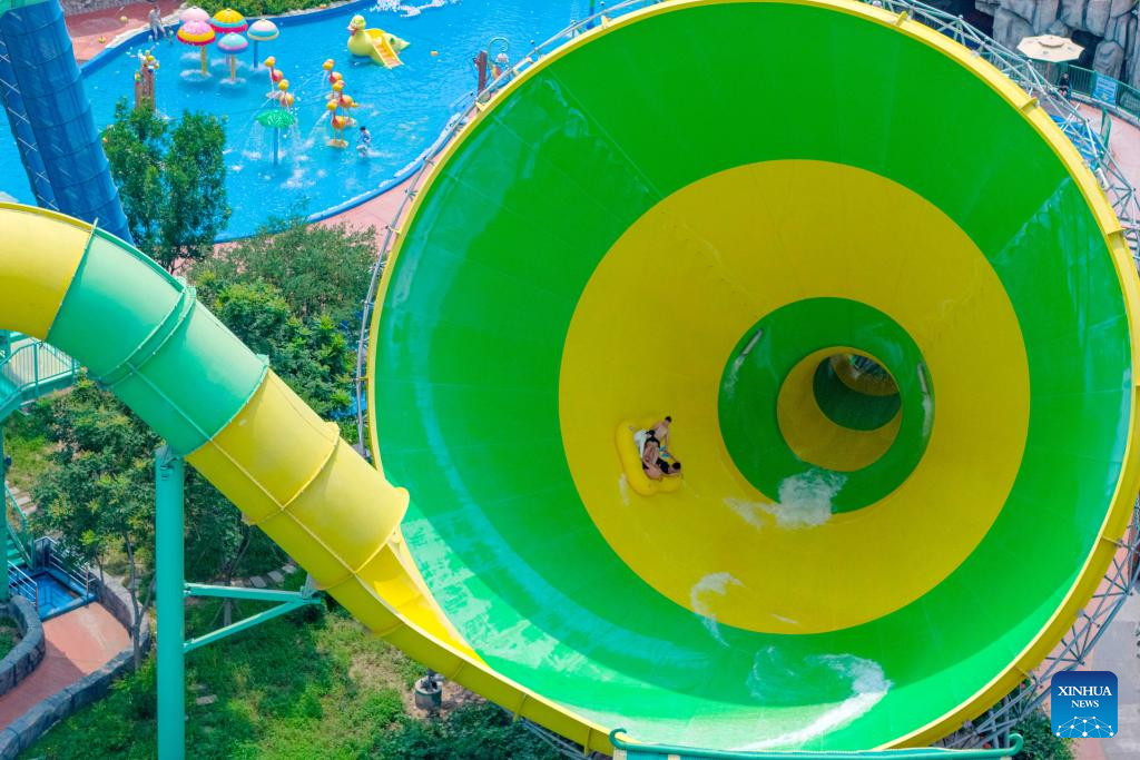 A drone photo taken on July 12, 2025 shows visitors enjoying themselves at Fantawild Water Park in north China's Tianjin Municipality. High temperature during the summer vacation has triggered new vitality of cooling economy across the country. (Photo by Du Penghui/Xinhua)
