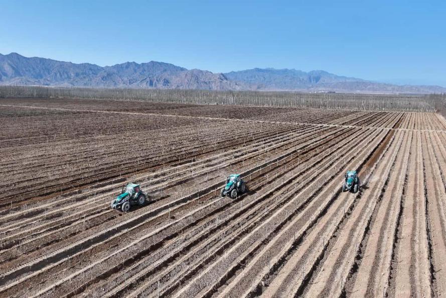 Agricultural machines work in a wine grape plantation at the eastern foothills of the Helan Mountain in northwest China's Ningxia Hui autonomous region, March 19, 2025. (Photo by Yuan Hongyan/People's Daily Online)