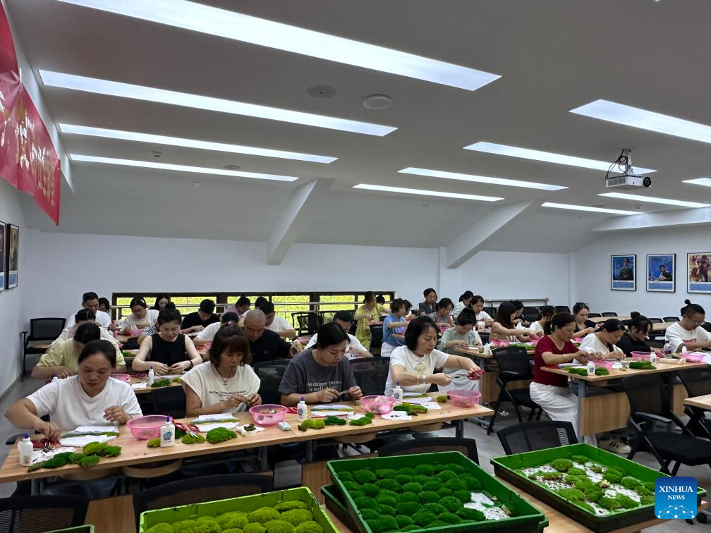 Local people attend a moss painting making technique examination in Maoyang Township, Jingning She Autonomous County in Lishui, east China's Zhejiang Province, June 30, 2025. (Xinhua)