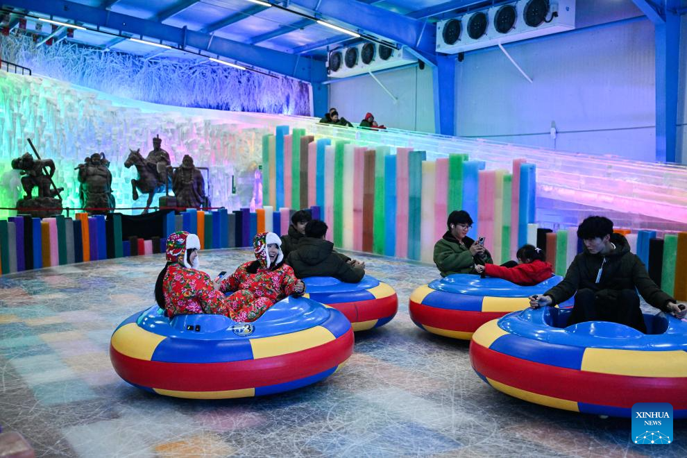 People visit an indoor snow and ice world in Huaian, east China's Jiangsu Province, July 15, 2025. An indoor snow and ice world, established at Jinhu water forest scenic spot in Huaian, provides tourists with a refreshing experience in summer. (Xinhua/Ji Chunpeng)
