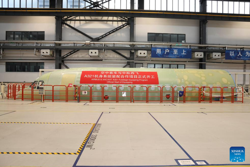 This photo taken on July 15, 2025 shows the site of the fuselage equipping program of the Airbus and the Aviation Industry Corporation of China Xi'an Aircraft International (Tianjin) Corporation (AVIC XAT) in Tianjin, north China. Airbus and the Aviation Industry Corporation of China Xi'an Aircraft International (Tianjin) Corporation (AVIC XAT), officially launched the first A321 aircraft fuselage equipping cooperative project in China on Tuesday. (Xinhua)