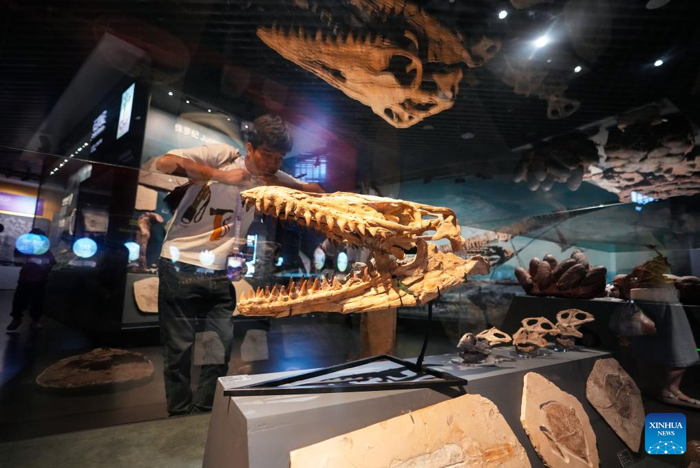Visitors take photos of animal specimens at the world natural heritage museum of the Chengjiang Fossil site in Chengjiang County, southwest China's Yunnan Province on July 15, 2025.