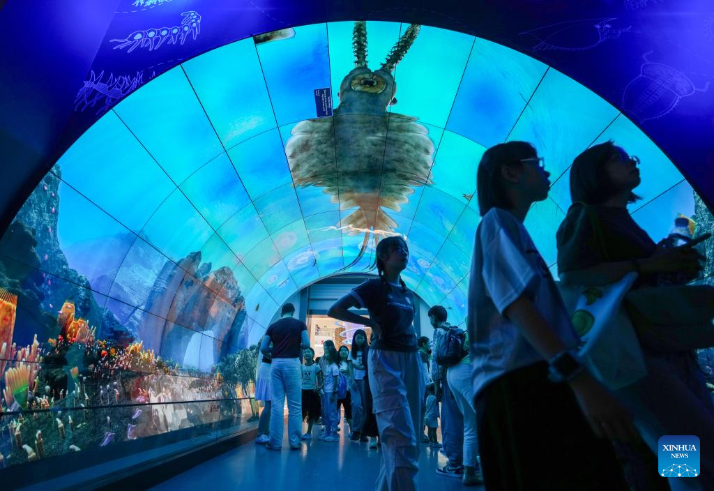Visitors view exhibits at the world natural heritage museum of the Chengjiang Fossil site in Chengjiang County, southwest China's Yunnan Province on July 15, 2025.