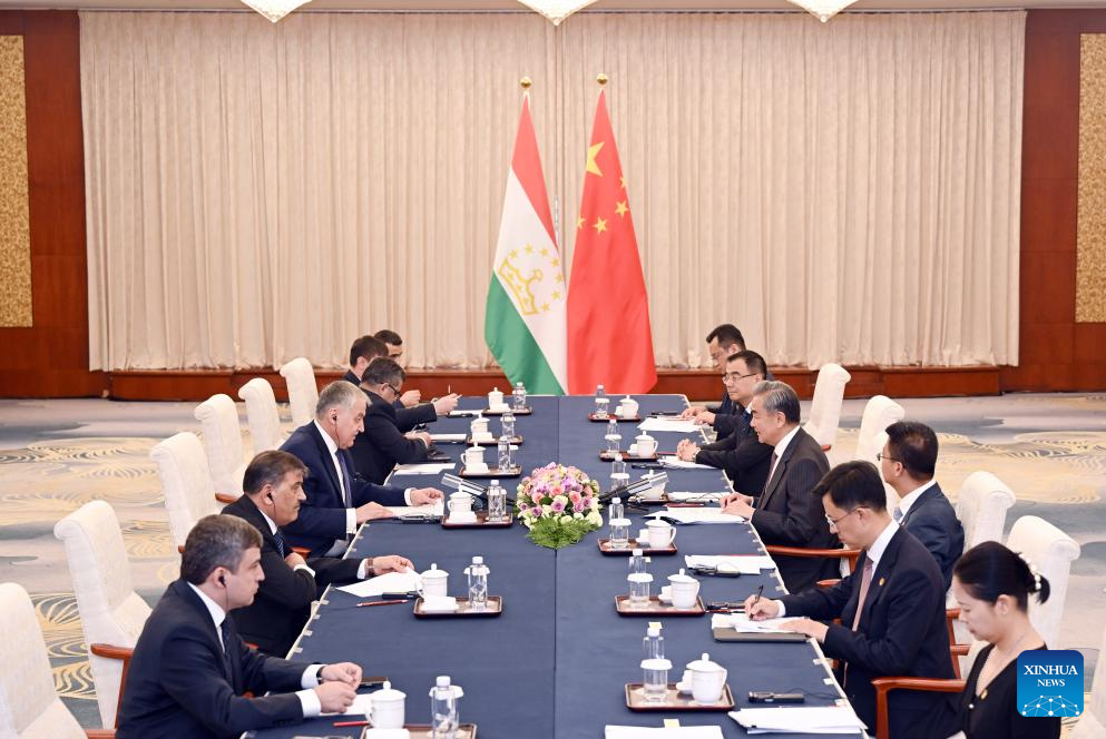 Chinese Foreign Minister Wang Yi, also a member of the Political Bureau of the Communist Party of China Central Committee, meets with Tajikistan's Minister of Foreign Affairs Sirojiddin Muhriddin in Tianjin, north China, July 16, 2025. (Xinhua/Zhao Zishuo)