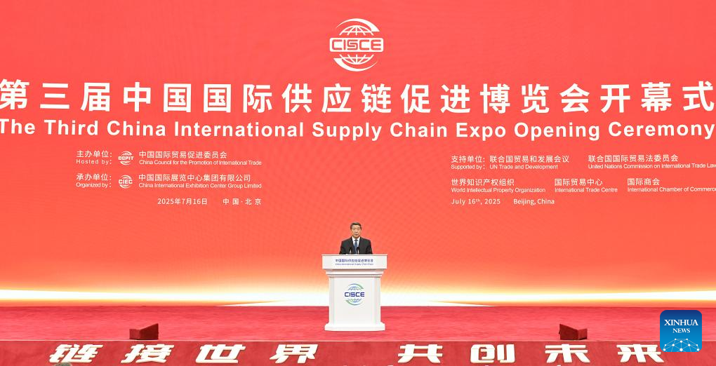 Chinese Vice Premier He Lifeng, also a member of the Political Bureau of the Communist Party of China Central Committee, attends the opening ceremony of the third China International Supply Chain Expo and delivers a speech in Beijing, capital of China, July 16, 2025. (Xinhua/Gao Jie)