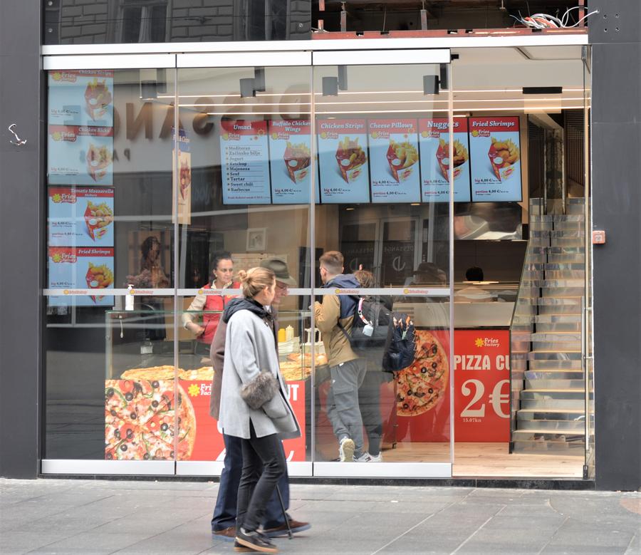People walk past a pizza shop in Zagreb, Croatia, on April 9, 2023. (Xinhua/Li Xuejun)
