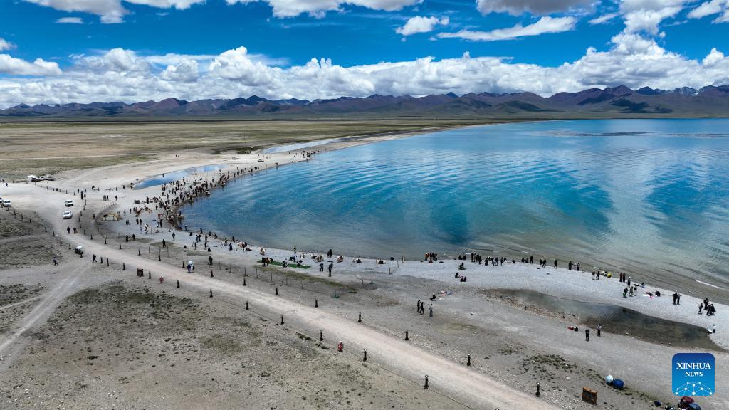 Tourists pose for photos in Zhaxi island scenic area of Nam Co, the world's highest saltwater lake in southwest China's Xizang Autonomous Region, July 16, 2025. Nam Co, located in the Qinghai-Xizang Plateau, with a lake-surface elevation of 4,718 meters, is the second largest lake in the region. (Xinhua/Jigme Dorje)