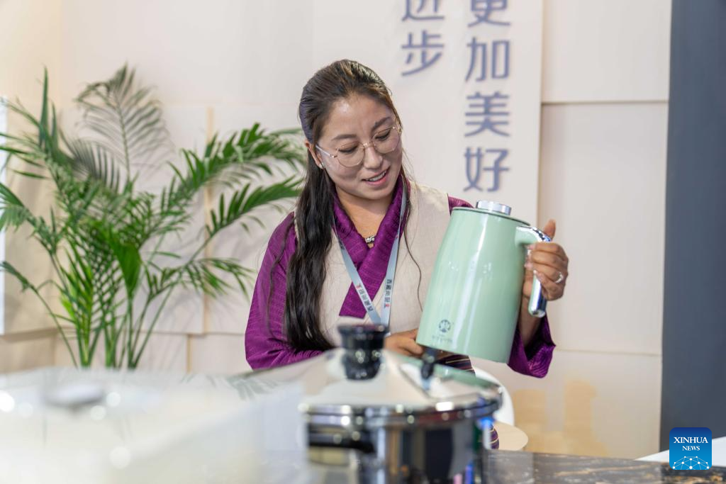 A staff member displays a kettle at a cookware company in southwest China's Xizang Autonomous Region, July 17, 2025. Daily cooking is a major issue for residents of the Qinghai-Tibet Plateau, which has an average altitude of over 4,000 meters. Water boils at relatively low temperature due to the low air pressure there, making pressure cookers a necessity.