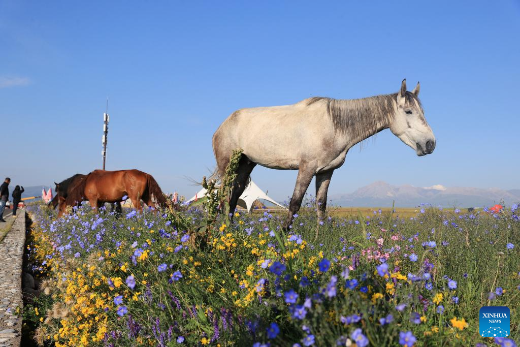 Horses are seen by the Sayram Lake in Bortala Mongolian Autonomous Prefecture, northwest China's Xinjiang Uygur Autonomous Region, July 17, 2025. Nestled in the Tianshan Mountains, Sayram Lake, Xinjiang's highest and largest alpine lake, has entered its peak tourist season in midsummer. (Photo by Zhang Limin/Xinhua)