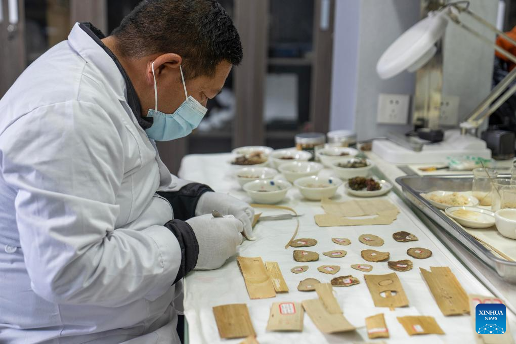 A member of an expert team on experimental repairing of Pattra-leaf Scriptures works on pattra leaves at Potala Palace in Lhasa, capital of southwest China's Xizang Autonomous Region, May 25, 2025. (Xinhua/Li He)