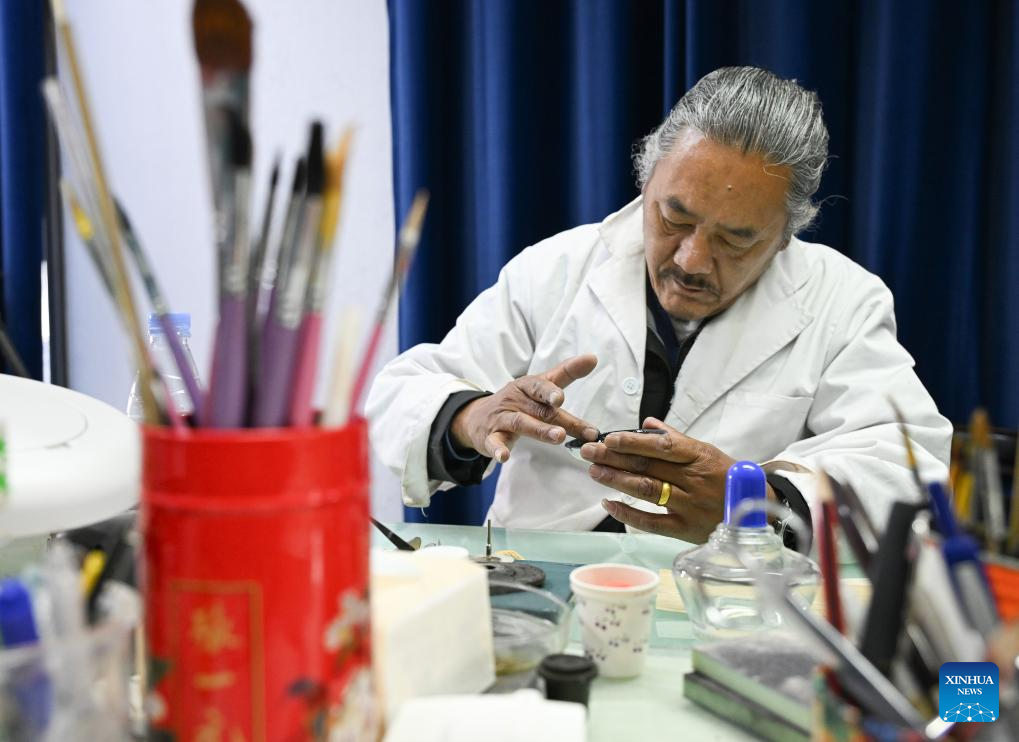 A member of an expert team on experimental repairing of Pattra-leaf Scriptures grinds pigments for repairing at Potala Palace in Lhasa, capital of southwest China's Xizang Autonomous Region, May 25, 2025. (Xinhua/Tenzing Nima Qadhup)