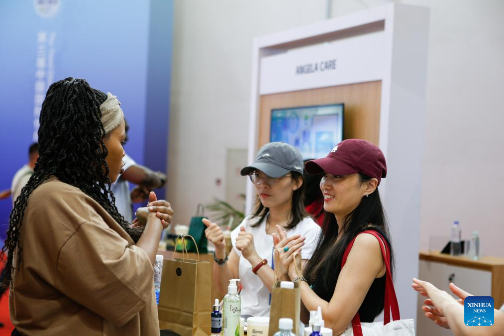Visitors try skincare products at the booth of South Africa during the third China International Supply Chain Expo (CISCE) in Beijing, capital of China, July 16, 2025. Themed on "Connecting the World for a Shared Future," the 2025 CISCE runs from July 16 to 20, gathering more than 650 companies and institutions from 75 countries, regions and international organizations. Overseas exhibitors accounted for 32 percent among all, or 3 percentage points higher compared to the previous edition. This year's event also saw more than 170 visitor delegations from abroad, and over 230 exhibitors here are first-timers. (Xinhua/Ding Hongfa)