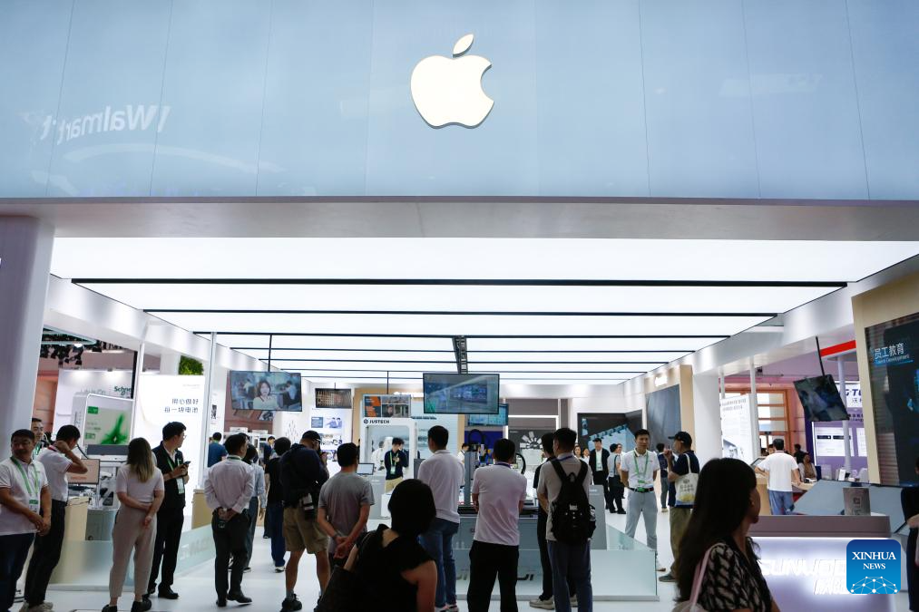 This photo taken on July 17, 2025 shows the booth of Apple during the third China International Supply Chain Expo (CISCE) in Beijing, capital of China. Themed on "Connecting the World for a Shared Future," the 2025 CISCE runs from July 16 to 20, gathering more than 650 companies and institutions from 75 countries, regions and international organizations. Overseas exhibitors accounted for 32 percent among all, or 3 percentage points higher compared to the previous edition. This year's event also saw more than 170 visitor delegations from abroad, and over 230 exhibitors here are first-timers. (Xinhua/Ding Hongfa)